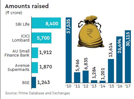 With the initial public offering (IPO) of SBI Life getting fully-subscribed, fund-raising through the IPO route so far in 2017 has crossed Rs 30,000 crore. Since the beginning of the year, 23 firms have together mopped up Rs 30,115 crore. In 2016, 26 firms had raised Rs 26,494 crore. Listing gains and returns by newly listed companies as also the positive sentiment in the broader market are among the reasons attributed to the trend. Most companies — 14 out of 20 companies — that made their debut on the exchanges this year have listed at a premium. Avenue Supermarts, the owner of the D-Mart brand, listed at a whopping 102% above its issue price. This is the biggest listing day opening in 12 years after Nandan Exim whose stock opened at 140% premium to its issue price of `20 in June 2005.