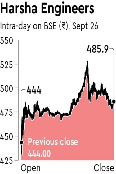 Shares of Harsha Engineers International on Monday made a stellar debut on the bourses, listing at Rs 444 apiece on the BSE, a premium of 34.5% over the issue price. The shares hit a high of Rs 527 during intraday trade before settling at Rs 485.9 apiece on the BSE, up 47% over the issue price.