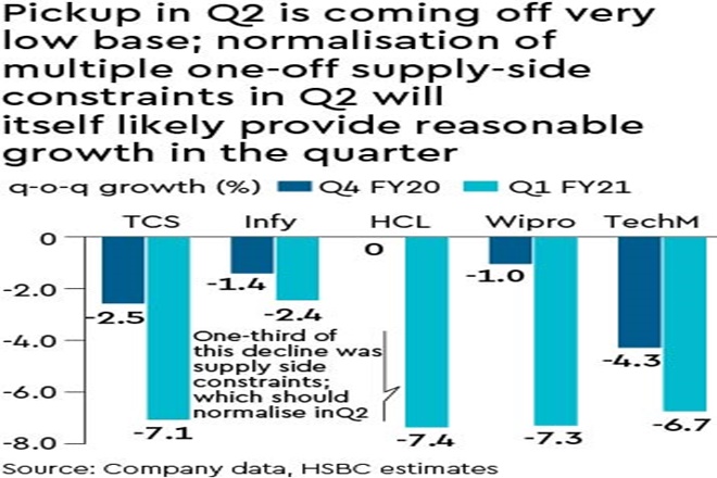Investor sentiment on Indian IT stocks appears buoyant driven by positive surprises in Q1FY21 and then the recent HCLT announcement. We continue to like the sector, especially in the medium to long term, but the recent euphoria is a little worrying to us near term. In the past six months, IT companies have seen revenue declines of 4-10%. Just a normalisation of some of the one-time issues themselves should drive decent growth in Q2FY21e. However, deal signings in Q2FY21 were not as strong as we had earlier expected, which does not bode well for Q3FY21e or even Q4FY21e. Based on typical seasonality, Q3FY21e could be a shade better but is unlikely to be materially better.
