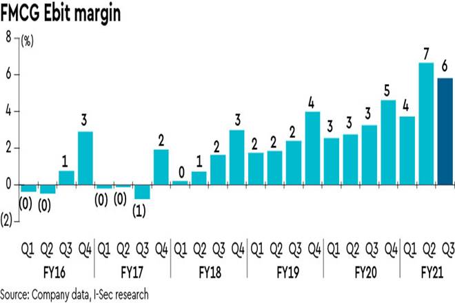FMCG profitability expansion continued but at a moderated pace: FMCG revenues grew 8% y-o-y on a reported basis which moderated sequentially with consumers broadening their purchase assortment and lower ‘at-home’ consumption on the back of increased mobility. Adjusting for the Lifestyle retailing business restructuring and stationery products (impacted due to closure of educational institutes), revenue grew 11%. Staples, Convenience Food and Health & Hygiene products (75% revenue contribution) growth decelerated to 11% (25% in Q2) while discretionary and out-of-home consumption products recovered to a 11% growth (from -2% in 2Q).
