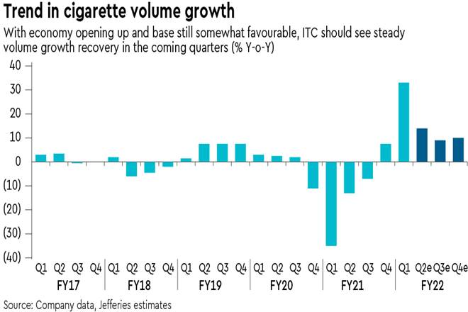 Cig. recovery: With stable taxation & tailwinds from economy opening up, cig. volumes are likely to see a recovery in the coming quarters. Even in Q1FY22, impact of the second wave was lower vs. last year, and recovery has been strong since mid-Jun’21. As mobility further picks up, volumes are likely to rise sequentially. This should drive strong growth in cigarette Ebit and we forecast >15% y-o-y in FY22.