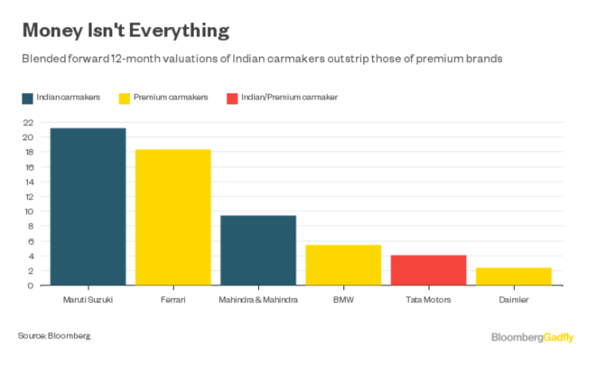 The bull case for a spin-out is represented by Ferrari NV. With an enterprise value that’s 16.1 times blended forward 12-month Ebitda, Ferrari’s premium is the highest for a carmaker in developed markets after the bubblicious Tesla Inc. Price JLR’s $2.25 billion of fiscal 2017 Ebitda the same way, and add on the 1.9 billion pounds ($2.4 billion) of net cash on its balance sheet, and you have a market capitalization of $39 billion. That’s almost twice the value of Tata Motors as a whole.