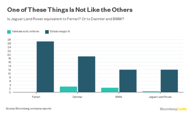 A less favorable point of reference would be Daimler AG and BMW AG, which like JLR are focused more on the top 1 percent of the income spectrum than the 0.01 percent. Their respective outputs of 3.1 million and 2.4 million cars a year, and margins of 19 percent and 12 percent, are closer to JLR’s 600,000 run rate and 12 percent margins.