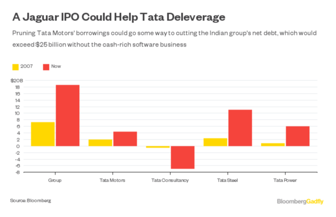 With analysts reckoning that JLR accounts for 90 percent of Tata Motors’ fair-market value, it makes sense — as Gadfly has argued — to unlock that worth by listing the luxury carmaker outside India. That’s especially so if it helps reduce the salt-to-software group’s net debt of almost $26 billion.