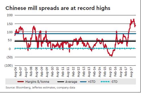 Capacity closures, strong Chinese steel demand have lifted Chinese mill utilisation to over 80% in CY17 (75% CY16). Winter restrictions till mid March have pushed effective utilisation further to over 90%, supporting the record high spreads that we see currently. Seasonal pick-up in Chinese demand post Chinese New Year along with ongoing winter restrictions should support strong spreads and regional steel prices near term, but steady ramp-up of output (down 80 mn tons vs. Aug annualised) and slowing Chinese demand may lead spreads to moderate, especially as effective utilisation falls back to mid-80s. Spreads at Chinese mills are $138/ton vs. 10 year average $45/ton (average +SD $86/ton). Moderation of spreads to even high, but more sustainable levels may weigh on regional prices.