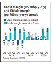 Excluding the Ind-AS 116 impact, underlying Ebitda was up 9.7% to Rs 1.6 bn with the margin at 16.4%. Gross margin expanded by 70bp y-o-y to 75.3% and Ebitda margin by 700bp y-o-y to 23.8%. Underlying Ebitda margin contracted 30bp y-o-y to 16.4%.