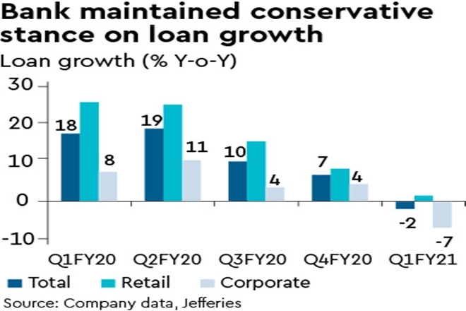 Encouraging decline in moratorium loans: Management clarified that 80% of moratorium loans are secured and hence even in case of slippages, the loss-given-default should be manageable. Key would be to see the normalisation of collections from loans that exited Phase 1 moratorium. Bank has accelerated downgrade of some stressed cases to NPLs which lifted NPLs by 12% q-o-q to 2.7% of loans. NPL coverage is at 68%.