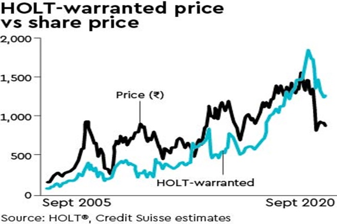 HOLT suggests stock prices in nil revenue growth at current levels: Historically, L&T has traded at a 30% premium to the HOLT-warranted price (between 2014 and 2019) but is now showing a 41% upside potential post its de-rating this year. Using our estimates of sales and Ebitda margins for the next two years, L&T is now priced for a 0% long-term sales growth by 2024, which appears overly pessimistic.
