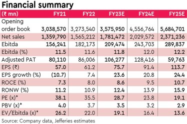 Reduction of IDPL’s annual loss of `100-150 crore will help EPS: L&T IDPL reflected as a JV investment for L&T and hence there will be no debt reduction for the consolidated B/S from this sale. L&T’s investment value is approximately `1,100-1,150 crore, and the gain of `240-290 crore on sale post tax will be a one off gain. However, between reduction of IDPL’s annual loss in JV and other income from the `1,300 crore proceeds post tax, L&T’s FY24-25estimates EPS could see 1.5-2% accretion.