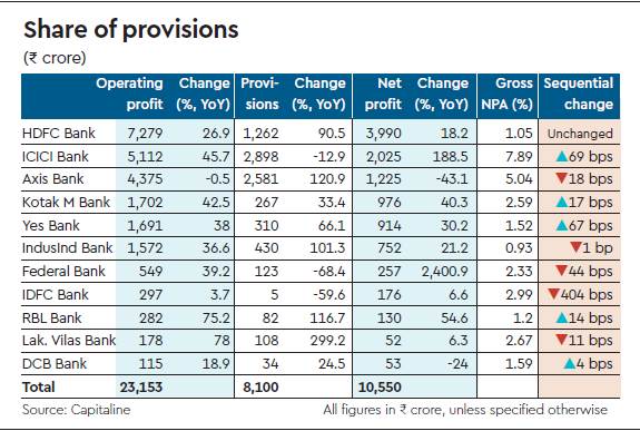 Most of them saw a rise in provisions on a year-on-year (y-o-y) basis, with Lakshmi Vilas Bank seeing the largest jump — nearly 300% — to Rs 108.19 crore. Among large banks, Axis Bank recorded the steepest climb in provisions, which rose nearly 121% y-o-y to Rs 2,581.25 crore.