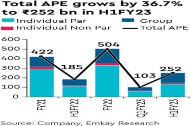 Annualised premium equivalent for H1FY23 grew at 36.7% to Rs 25,230 crore, led by strong 67.5% growth in the group business and Covid-19 Delta wave, which affected lower retail APE base of H1FY22. Strong growth in Group APE was driven by robust growth in the annuity product. VNB margins expanded to 14.6% for H1FY23 versus our expectation of 13.8%. Y-o-Y improvement in VNB margin was driven by a combination of factors, including higher interest rates, increased annuity in group business, change in profit sharing in PAR, and growing non-par in the retail business mix. H1FY23 PAT of Rs 16,600 crore was largely driven by Rs 14,300 crore of surplus transfer from non-par funds to shareholders’ fund, as enabled by accounting policy change post fund bifurcation done from H2FY22.