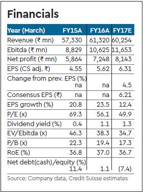 As is normal for Marico, in years of high input cost inflation in copra, the gross margin dips as the price hike does not fully pass on the input cost inflation. However, normally the Ebitda margins decline only marginally as the operating leverage from the high revenue growth offsets some of the gross margin loss at the Ebitda level. However for FY18 the management has guided for a substantial 150-200 bp drop in Ebitda margins. The main reason is that ad spends are likely to increase, as new product launches planned for 2H FY17 were pushed back due to the demonetisation related issues. We however feel that the Ebitda margin drop will be contained within 100 bp as there will be operating leverage on other overhead costs.