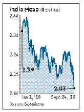 With Monday’s decline, the Indian stock market has lost about $437 billion in value since touching a record high capitalisation of $2.47 trillion in January 2018. This fall is second only to the contraction in the Chinese market during this period. China lost $1.75 trillion of market value since the beginning of 2018, although since its peak in June 2015 its market capitalisation had eroded 40.6% to $5.97 trillion.