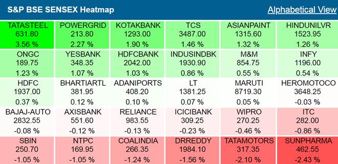 Shares of Tata Steel, Power Grid, Yes Bank, ONGC, Kotak Mahindra Bank, ICICI Bank, IndusInd Bank, TCS, HDFC Bank, SBI, Axis Bank, Asian Paints and HUL were the top gainers while Tata Motors and ITC were major laggards among BSE Sensex components.