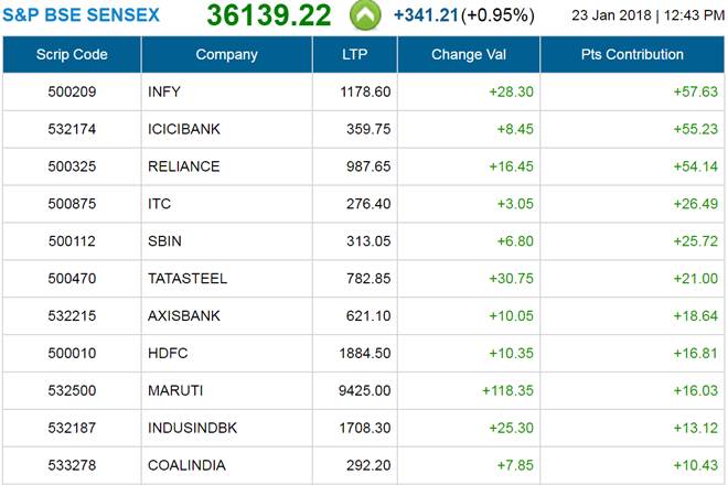 12:43 pm: Domestic markets continue to roll with Sensex and Nifty firing to newer all-time highs minute after minute. Heavyweight shares of companies such as Infosys, ICICI Bank, Reliance Industries, ITC, SBI, Tata Steel, Axis Bank, HDFC, Maruti Suzuki, IndusInd Bank, and Coal India emerged as the top contributors to Sensex. Collectively these 12 stocks added about 315.24 points to the Sensex out of the 341-point gain in the index.