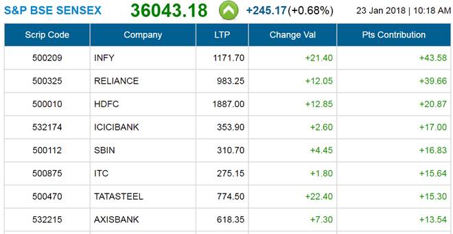 10:15 am: Heavyweight stocks of companies such as Infosys, Reliance Industries, HDFC, ICICI Bank, State Bank of India, ITC, Tata Steel Axis Bank are contributing heavily in the Sensex upmove. Collectively these 8 stocks alone added about 182 points to the index out of the 245-point rally in the index.