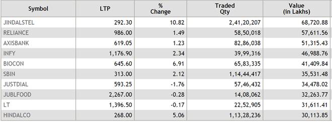 11:55 am: Shares of blue-chip companies such as Jindal Steel, Reliance Industries, Axis Bank, Infosys, State Bank of India emerged topped the turnover on NSE with Jundal Steel rising as much as 10.82% to Rs 292.3.