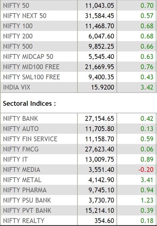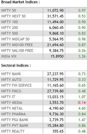 15:30 pm: Markets finish at record highs: Indian stock markets close at record highs with the key equity indices Sensex and Nifty finishing at respective peaks. Sensex ended up 341.97 points or 0.96% at 36,139.98 and Nifty gained 117.5 or 1.07% to conclude at 11,083.7 while Nifty Bank surged 1.27% to close at 27,384.5. During the day, the benchmark Sensex jumped 372.82 points to mark the all-time high of 36,170.83 whereas the 50-share barometer Nifty advanced 126.7 points to hit an intraday all-time high of 11,092.9.