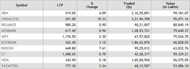 14:57 pm: Shares of blue-chip companies such as State Bank of India, Jindal Steel, Reliance Industries, Axis Bank, Infosys and ICICI Bank emerged as the top turnover stocks on NSE with value traded in shares of India’s largest bank SBI nearing to Rs 1,000 crore.