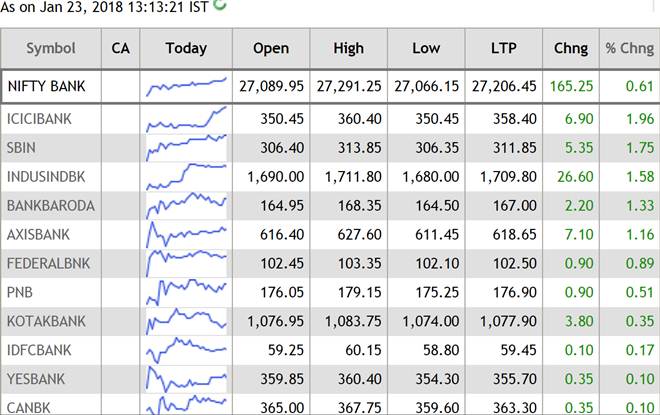 13:13 pm: PSU bank stocks are also shining in today’s trade with benchmark Nifty PSU bank index surging 49.05 points 1.33% to 3,734.55 led by the upmove in the shares of heavyweight companies such as State Bank of India, Bank of Baroda and Punjab National Bank. Nifty Bank index was trading up 0.61% at 27,206.45 with shares of ICICI Bank emerging as the top gainer.