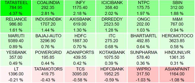 12:33 pm: Dalal Street roars! Indian stock markets continue the rising streak on Tuesday following a sustained rally in the blue-chip shares such as Tata Steel, Coal India, Infosys, SBI, Vedanta, Hindalco, Cipla, GAIL, IOC, ICICI Bank, NTPC, Dr Reddy’s, Reliance Industries, IndusInd Bank, and Axis Bank. Sensex was trading up 343.59 points or 0.96% at 36,141.60 while Nifty was trading at 11,077.75 up by 111.55 points or 1.02%.
