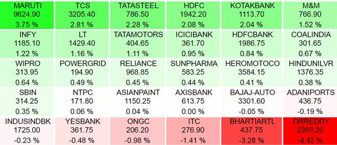10:22 am: Shares of Maruti Suzuki, TCS, Tata Steel, HDFC, Kotak Mahindra Bank, M&M, Infosys and L&T rise 1-4% today with stocks of Maruti Suzuki, TCS, HDFC and HDFC Bank adding the most to the headline index. Meanwhile, shares of pharma major Dr Reddy’s, India’s largest telecom company Bharti Airtel, FMCG giant lost 1-5% with Dr Reddy’s Lab shedding the most after dull Q3 results and Airtel extending Thursday’s losses following one after the other tariff revisions by the neck to neck rival Reliance Jio Infocomm Ltd.