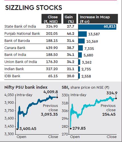 Stocks of state-owned banks were on fire on Wednesday following the the government’s promise of a capital infusion of a whopping RS 2.1 lakh crore. The trading session was dominated by shares of these banks, which added a chunky Rs 1.2 lakh crore in market capitalisation. Interestingly, foreign portfolio investors shopped for equities worth $550 million on Wednesday, the first time they have spent as much in 100 sessions save one. Expectedly, the country’s biggest lender, State Bank of India — which should get a good share of the infusion — rallied 27.7%, adding Rs 60,812 crore in market value. The Nifty PSU Bank index, which has not gone anywhere over the past year, rose by nearly 30% with Punjab National Bank gaining more than 46%.