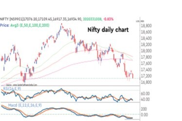The formation of lower tops and lower bottoms has continued as Nifty closed below previous swing low of 16,972. Nifty is currently placed below its 20, 50, 100 and 200 days’ exponential moving average (EMAs). This indicates bearish trend on all time frames. In March itself, 50 days EMA crossed 100 days EMA on the downside, which indicates selling momentum on the short-term charts of Nifty index. At present 50 and 200 days EMA both coincide at 17,540 odd levels and that seems to have become a ceiling for the Nifty as far as intermediate trend is concerned. For the short-term, the recent swing high of 17,207 is expected to act as a resistance for the Nifty.