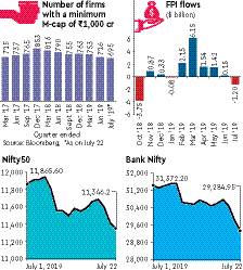 The broader market has been in bearish mode for more than six quarters now; the number of companies with a market capitalisation of Rs 1,000 crore or more has fallen to below 700 from the peak of 853 in Q3FY18. That’s despite the fact that FPIs were buyers in every month between February and June and indicates that the benchmark indices have been held up by the rise in just a bunch of stocks masking the weakness in the rest of the market. Sensex has shed 1,200 points in the last three sessions, taking the benchmarks down to a two-month low.
