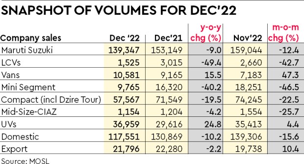 The company’s Dec’22 wholesales were in line with MOSL’s own estimates of 139.35k units, which was a decline of 9% y-o-y. Domestic volumes declined 10% y-o-y to 117.55k units. The compact segment volumes declined 19.5% y-o-y to 57.6k units (est. 69k units). Mini segment volumes declined 40% y-o-y to 9.8k units (est. 15k units). UV segment volumes grew 25% y-o-y to 37k units (est. 33k units). “We estimate FY23 estimate volumes to grow by 21% y-o-y, implying a residual growth of 13%, or run-rate of 184.7k units. The stock trades at 35.5x/22.2x FY23E/FY24E earnings. We maintain our BUY rating with a TP of `11,250 the brokerage has said.