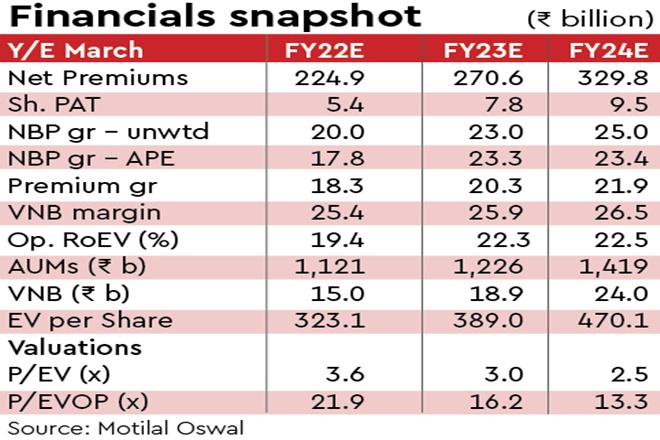 It expects growth to pick up over the next five years, which is likely to be better than the past five years. Growth via the proprietary channel is likely to remain strong, while banca will continue to deliver healthy growth. Persistency trends have improved, while cost ratios should remain modest. We estimate 21% APE CAGR over FY21-24E, with VNB margin sustaining at 25-26%. This would enable 24% VNB CAGR over FY21-24e, while operating RoEV would sustain at ~22%. We maintain our Buy rating with an unchanged TP of Rs 1,250 per share (3.6x Sep’23e EV with a 20% holding company discount).
