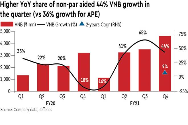 Premium growth and margin expansion drive VNB growth: Max posted strong 44% y-o-y growth in VNB. On q-o-q basis margins were down by 450bps, largely as it made additional reserves towards Covid risks arising from business written this year. Premium growth in Q4 was driven by non-par segment (up 165%) and rebound in Ulips (up 41%) whereas Par and protection were weak.