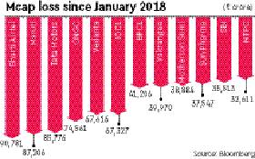 Poor corporate earnings, a shortage of liquidity and uncertainty ahead of the elections have left the Indian stock markets in a weak spot. The Sensex fell for the eighth straight session on Monday while the broader markets continued to be in the grip of the bears; a clutch of 128 top companies have lost more than Rs 5,000 crore in market capitalisation since January 2018. The combined erosion in market cap is a colossal Rs 20 lakh crore.