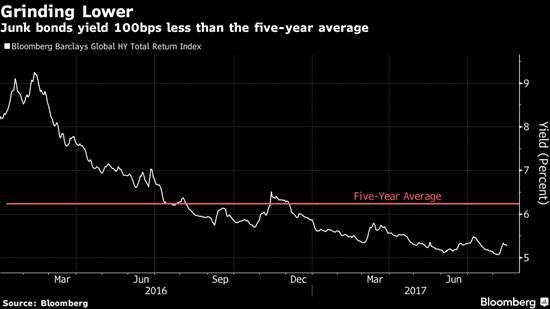 Investors overseeing about $1.1 trillion have been cutting exposure to the world’s riskiest corporate debt as rates grind too low to compensate for potential risks. Even after a selloff last week amid rising tensions between the U.S. and North Korea, a Bloomberg Barclays index of global junk bonds still yields 5.3 percent, 100 basis points below the average for the past five years.