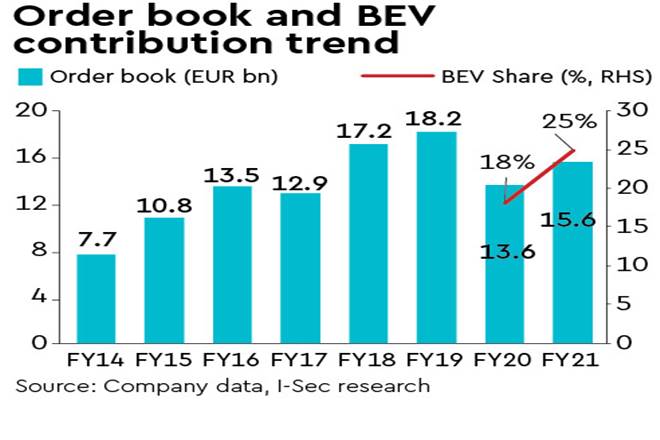 Key takeaways from earnings call: (i) Orderbook size reached EUR15.6 bn (25% from EVs) with EUR4.5 bn of new orders in H2FY21; EV order execution to be ramped up as customer programmes gather pace; (ii) SMRPBV witnessed strong working capital improvement (down from 11 to 5 days); overall capex for MSS to be Maintain Buy: The robust orderbook growth (20% jump over H1FY21) at EUR15.6 bn increasing BEV content (share of pure BEV orderbook at 25% vis-a-vis 21% in H1), is likely to support content per vehicle increase thesis.