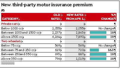 For private cars with engine capacity below 1,000 cc (Nano, Eon, Alto, Kwid), third-party premium will be `2,055; for 1000 cc-1,500 cc (Honda Jazz, Maruti Swift, Hyundai Grand i10, Volkswagen Polo) it will be `2,863. On March 28, the regulator had fixed `3,132 for this category of vehicles. For over 1500 cc, (Hyundai Verna, Hyundai Elantra, Skoda Octavia, Toyota Corolla) it will be `7,890 for a year. Irdai had fixed `8,630 for this category on March 28.