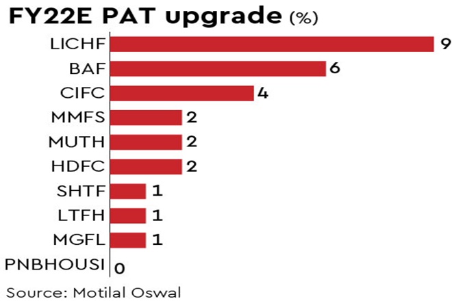 Players like CIFC and MMFS are likely to witness 70-160bp improvement in NIMs over FY20-23e. We increase our FY22e EPS estimates by low-to-mid single digits on average, with the highest upgrade of 9% for LICHF.