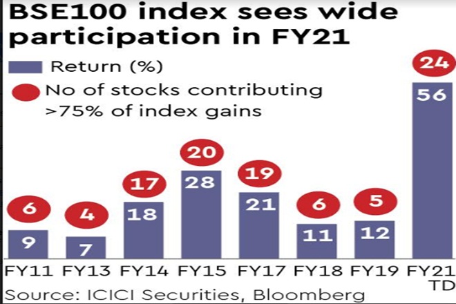 More than 75% of the BSE100 performance in FY21 so far has come from 24 stocks. In contrast, the same magnitude of returns were contributed by just five stocks in FY19 and six in FY18.