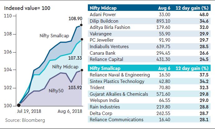 Among the Nifty small-cap stocks, Reliance Naval and Engineering, Sintex Plastics Technology, Trident and Gujarat Alkalies & Chemicals rallied in the range of 37.5% and 30% between July 19 and Monday, while the broader Nifty50 rose 3.9% during the same period.