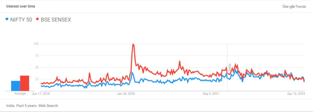 Apart from the declining active clients, the Google trend shows that while the search for the keywords ‘Nifty 50’ and ‘BSE Sensex’ was at its peak in 2022, it has declined over time and the graph shared by Nithin Kamath suggests that the interest is still decreasing.