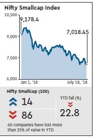 The combined market capitalisation of the index has fallen by Rs 1.3 lakh crore to Rs 4.7 lakh crore. In absolute terms, Rain Industries lost the most value as the market capitalisation of the cement maker has eroded by Rs 6,650 crore since the beginning of the year. It is followed by Jet Airways (Rs 5,956 crore) and Reliance Communications (Rs 5,375 crore). Of the 137 trading sessions so far this year, 73 days saw the small-cap gauge closing in the red.