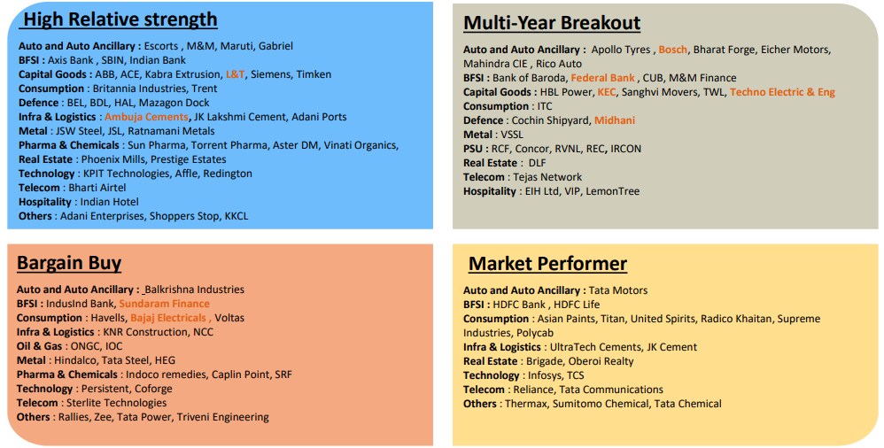 The brokerage divided the NSE universe of stocks into four categories – High Relative Strength, Multi-Year Breakout, Valuation Attractive, and Market Performer to pick the top investment bets for CY23. It believes that the top two buckets of high relative strength and multi-year breakouts have the highest potential for outperformance.