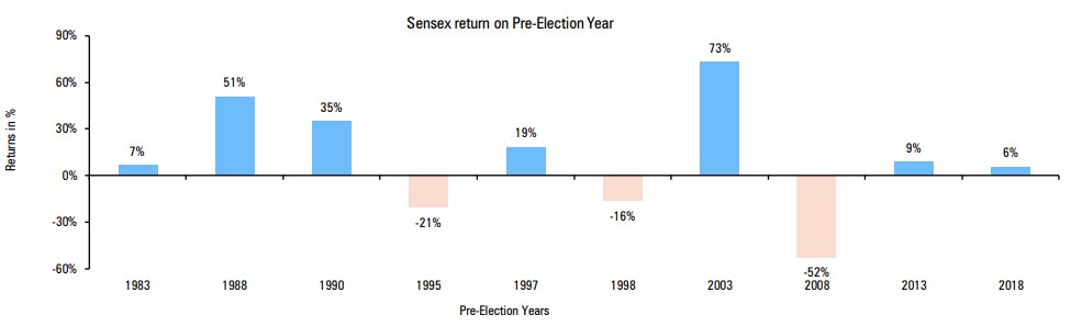 It has been observed that benchmark indices have performed relatively well in the pre-election year. The Nifty index has generated positive returns in seven out of the 10 instances. Out of the years where it delivered negative returns, two were 1995 and 1998 when there was an unstable political scenario in India, while the other one was 2008, the year of global financial crises.