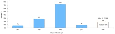 According to analysts, bulls will be on the winning side in CY23 as it will be the third year of the decade and it has been observed in the past that markets grow in the third year of the decade. In 1983, Nifty delivered 7% return to investors, 28% in 1993, a whopping 73% in 2003 and 9% in 2013. Next year, analysts at ICICIdirect project Nifty to hit 21500, delivering an 18% median return to investors. “We believe the up move towards 21400 would be in a non-linear manner. The corrective declines should not be seen as negative instead should be utilised to build long-term portfolio,” it said.