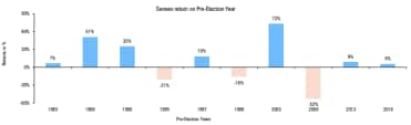 It has been observed that benchmark indices have performed relatively well in the pre-election year. The Nifty index has generated positive returns in seven out of the 10 instances. Out of the years where it delivered negative returns, two were 1995 and 1998 when there was an unstable political scenario in India, while the other one was 2008, the year of global financial crises.