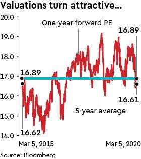 The valuation of the benchmark Nifty50 Index has slipped below its five-year average, as coronavirus-led sell-off saw the index plunging nearly 9% from its January highs. Even as the spread of Covid-19 has sent shivers across the global markets, a sharp sell-off was particularly seen in countries where a lesser impact was seen. Market participants say though the virus is being held responsible for the correction, the underlying trigger could also be premium valuations that these markets have been enjoying over the years.