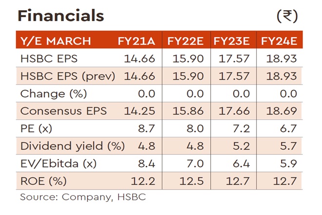 Maintain Buy and TP of Rs 180: We value NTPC’s core FY23e regulated equity at a justified P/B target of 1.6x and balance investments at 1x P/B. This results in our unchanged target price of Rs 180 which implies 1.2x FY23e P/B and implied upside of c42%. We rate the stock Buy. Key downside risks: aggressive bidding for renewable portfolio; delays in commissioning of plants.