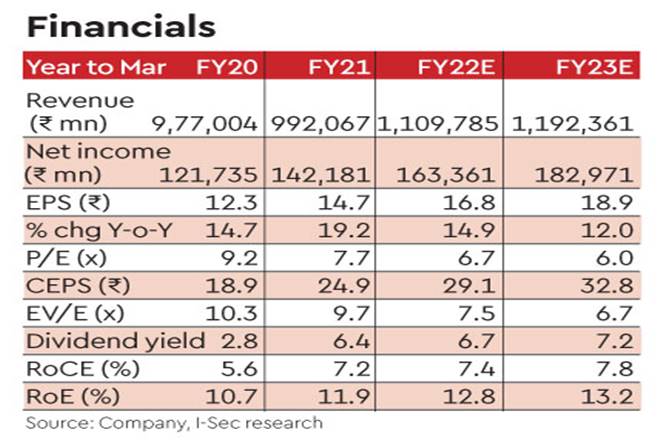 Receivables declined by Rs 29 bn q-o-q to Rs 128 bn (lower than FY20 level of Rs 142 bn), helped by PFC/REC scheme. NTPC’s final dividend of Rs 3.15/sh takes total FY21 payout to Rs 6.15/share (higher than policy and in addition to 2% share buyback). Maintain Buy.