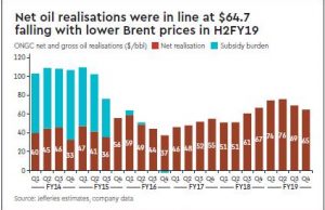 Q4FY19: ONGC’s std. 4QFY19 net fell 51% q/q (-32% y/y) to Rs 40.45 bn missing subsidy-adjusted JEFe by 19%. A Rs 2.2-bn forex gain and higher other income helped but higher dry-well write-offs (Rs 27 bn), a pick-up in survey expenses (Rs 9 bn) and a Rs 12-bn impairment were drags as were higher interest expenses as gross debt rose again to Rs 216 bn. The Rs 40-bn buyback would have weighed on cashflow although capex was softer than in earlier years.