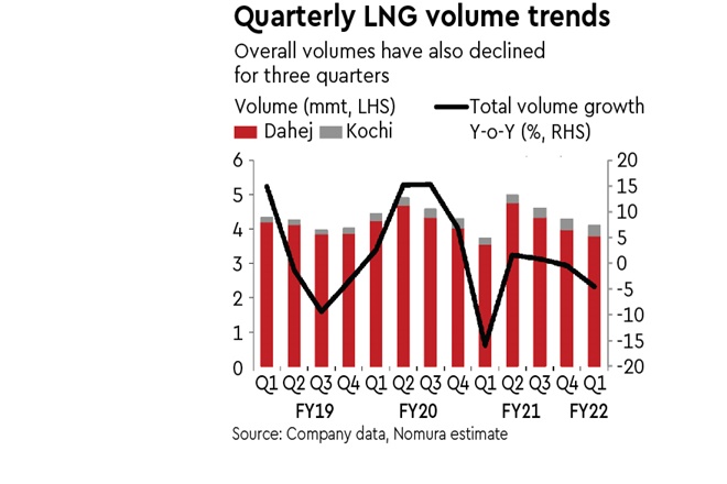 With weak macro, rising new domestic gas production and elevated LNG prices, India’s LNG imports outlook is weak. We continue to believe that Dahej terminal is vulnerable. Despite its 90-95% capacity tied up in long-term (LT) contracts, we expect Dahej’s utilisation to be below 90% over FY22-24F (vs 102-111% over FY15-20). In our view, Dahej’s vulnerability will rise as existing LT contracts begin to expire from 2027-28.